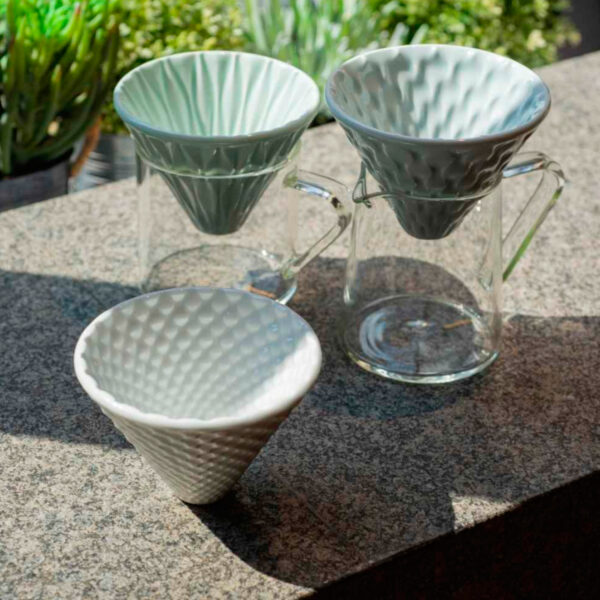 Mellow (blue celadon): smoother structure → rapid extraction → light and aromatic cup.